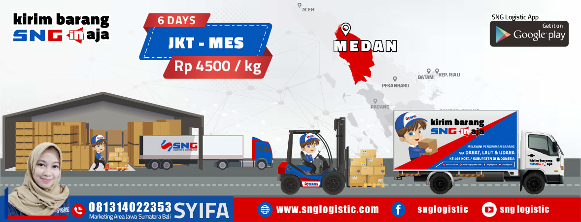 SNG Logistics melayani pengiriman barang ke Medan dengan tarif pengiriman yang kompetitif dan terpercaya. Kami menjangkau pengiriman meliputi beberapa kabupaten dan kota yaitu Kisaran, Limapuluh, Sidikalang, Lubuk Pakam, Dolok Sangggul, Kabanjahe, Rantau Prapat, Stabat, Panyabungan, Gunung Sitoli, Teluk Dalam, Sibuhuan, Gunung Tua, Salak, Pangururan, Sei Rampah, Pematangsiantar, Padang Sidempuan, Sibolga, Tarutung, Balige, Binjai, Medan, Tanjung Balai dan Tebing Tinggi.