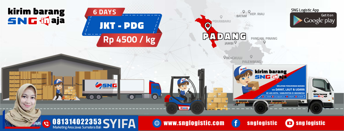 SNG Logistics melayani pengiriman barang ke Padang dengan tarif pengiriman yang kompetitif dan terpercaya. Kami menjangkau pengiriman meliputi beberapa kabupaten dan kota yaitu Lubuk Basung, Pualu Punjung, Sarilamak, Tuapejat, Pariaman, Lubuk Sikaping, Simpang Empat, Painan, Muara, Arosuka, Padang Aro, Batu Sangkar, Bukittinggi, Padang, Padang Panjang, Pariaman, Payakumbuh, Sawahlunto dan Solok.